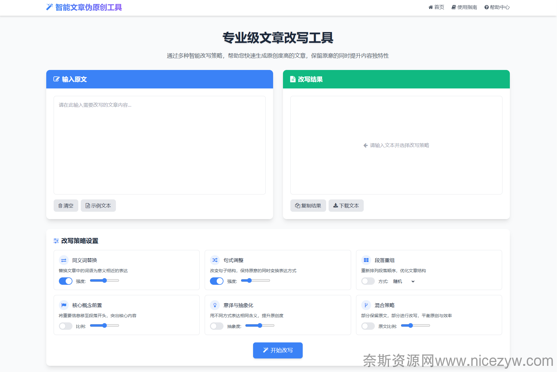 可视化操作界面:采用分区设计,左侧为原文输入区,右侧为改写结果区,中间提供详细的改写策略设置。