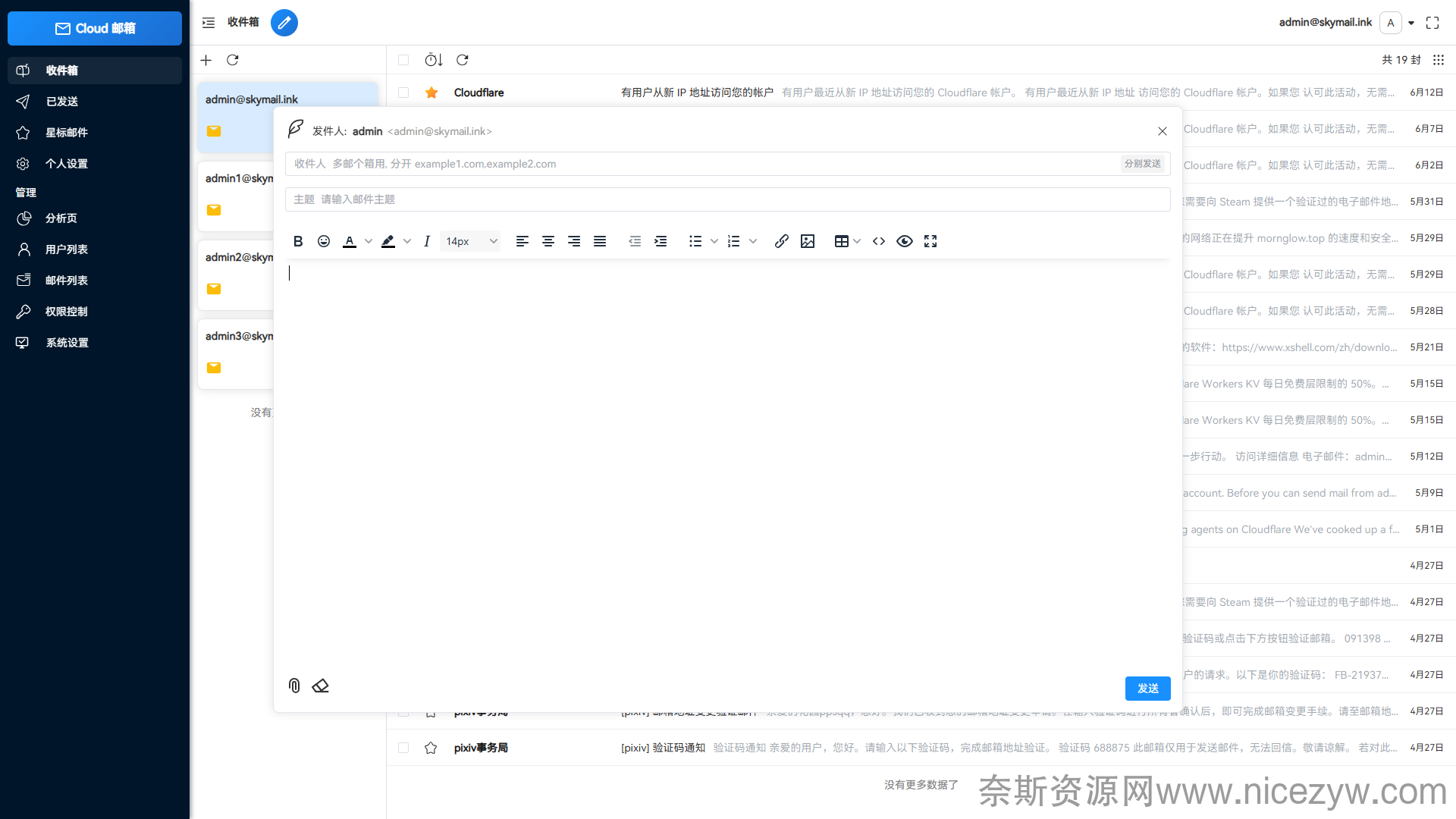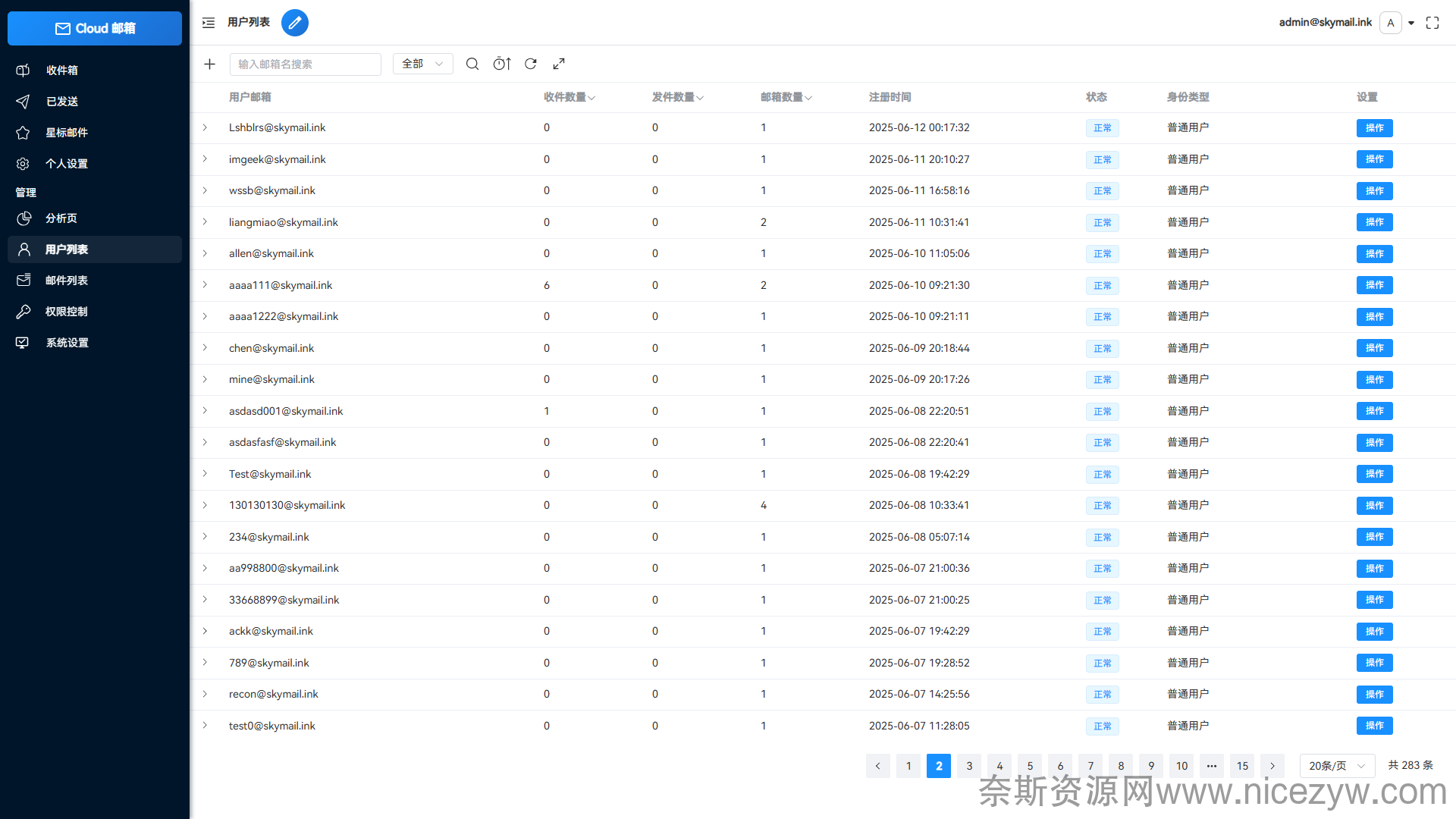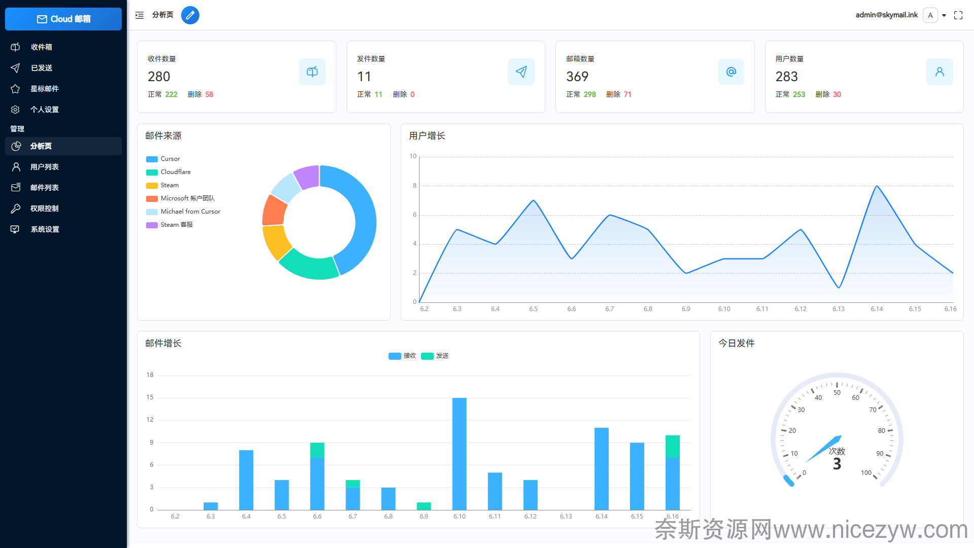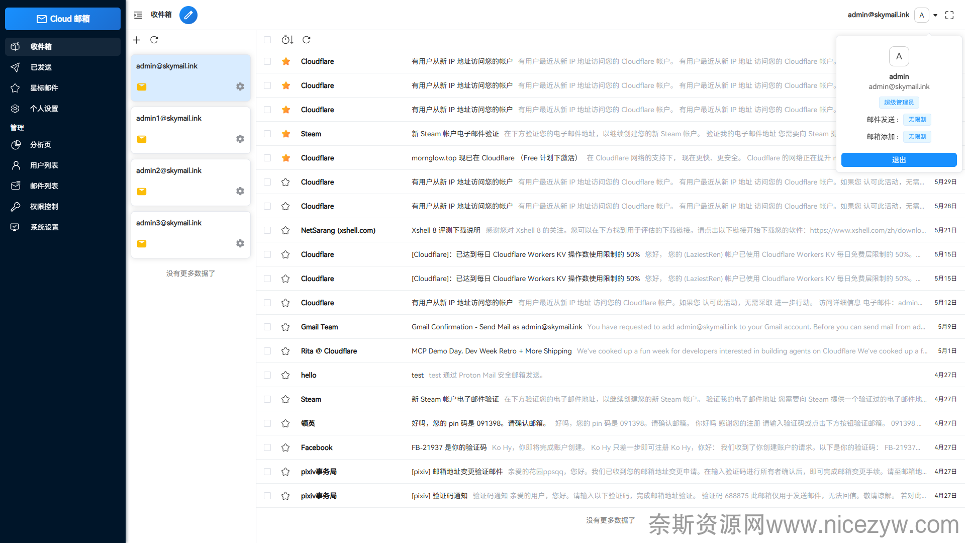 管理员功能:可以对用户,邮件进行管理,RABC权限控制对功能及使用资源限制