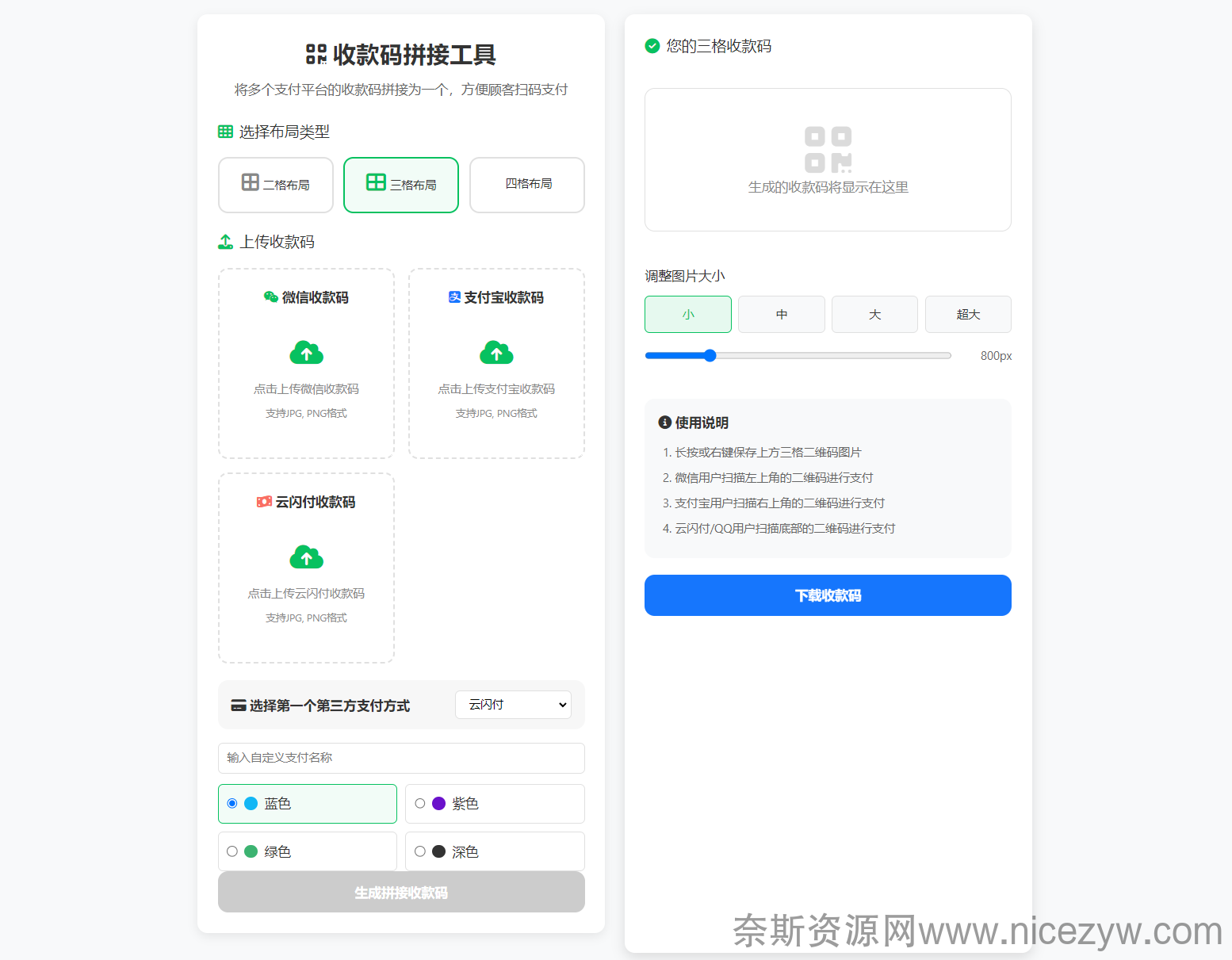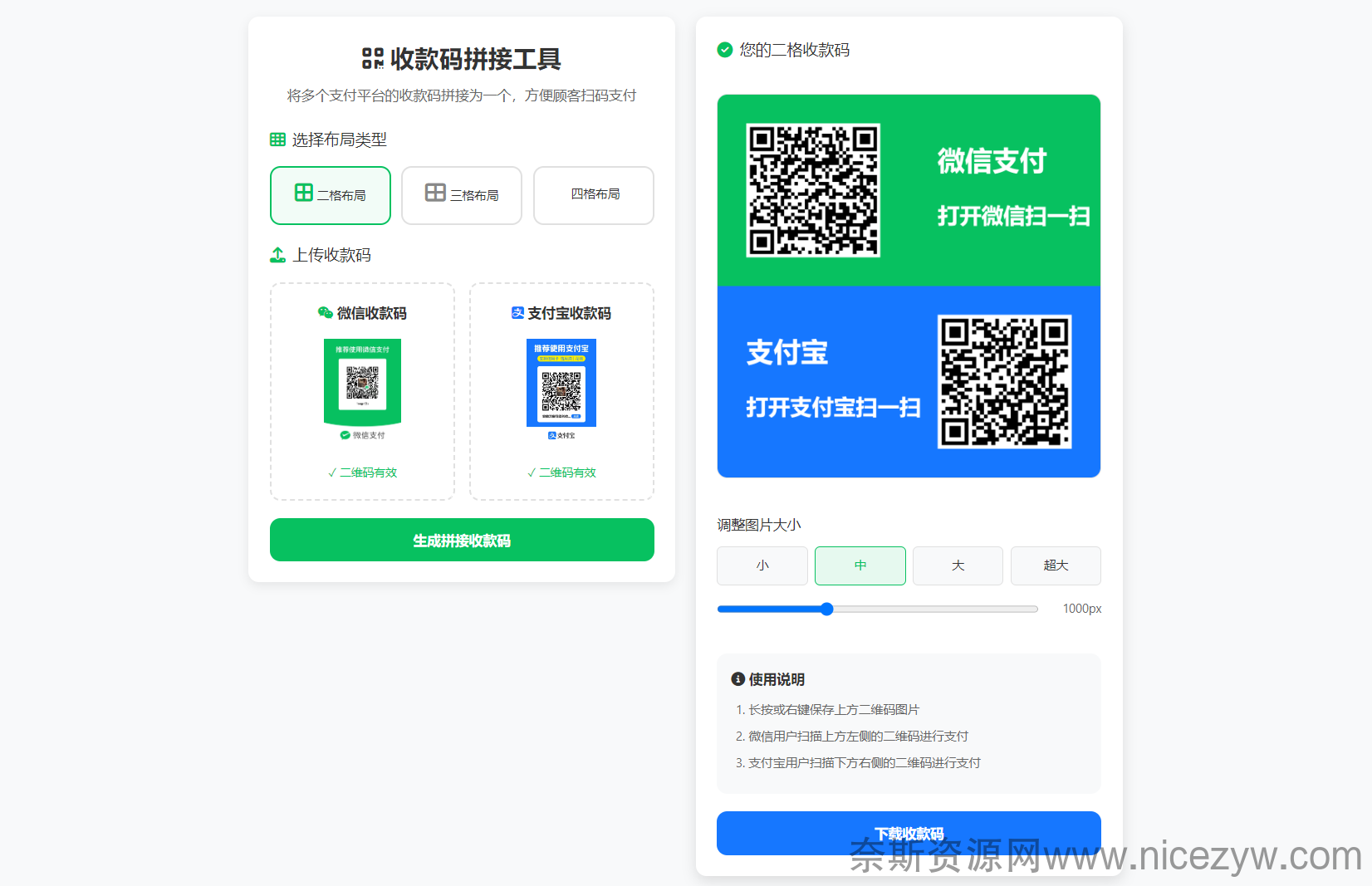 上传相应二维码,然后点生成,在右侧就可拼接出我们需要的二维码。