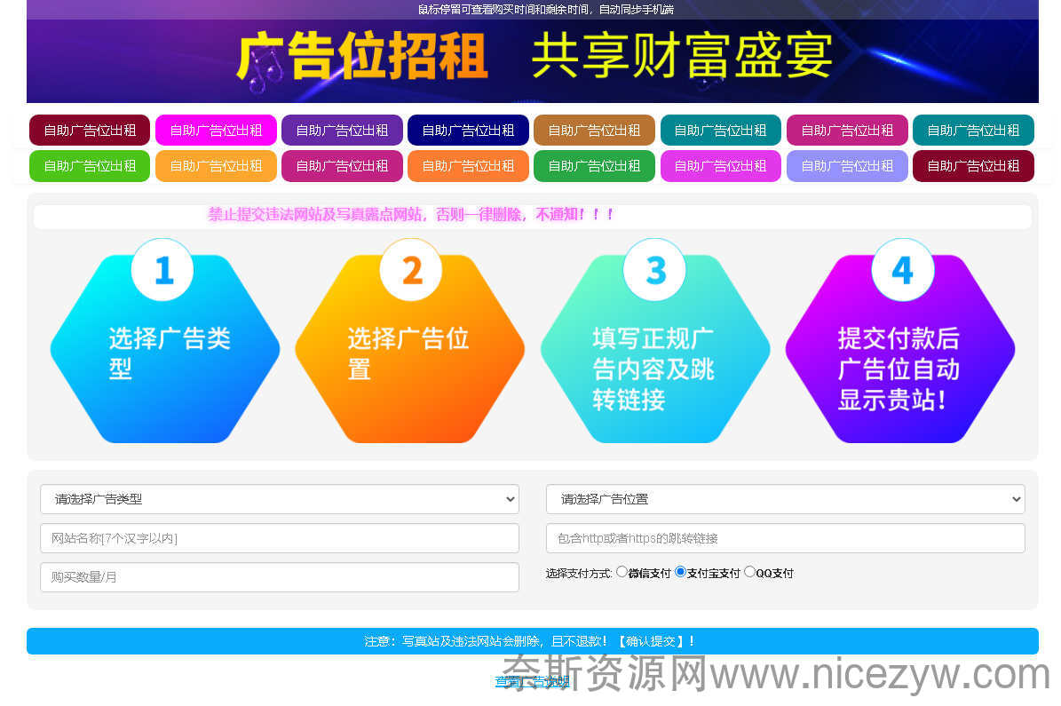 自助购买大横幅,小横幅,文字广告,后台可设置每个广告位的不同价格,颜色,宽高,自由增加修改广告位数量